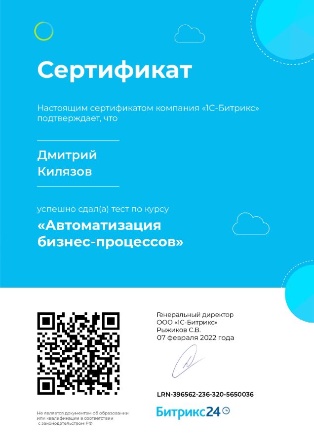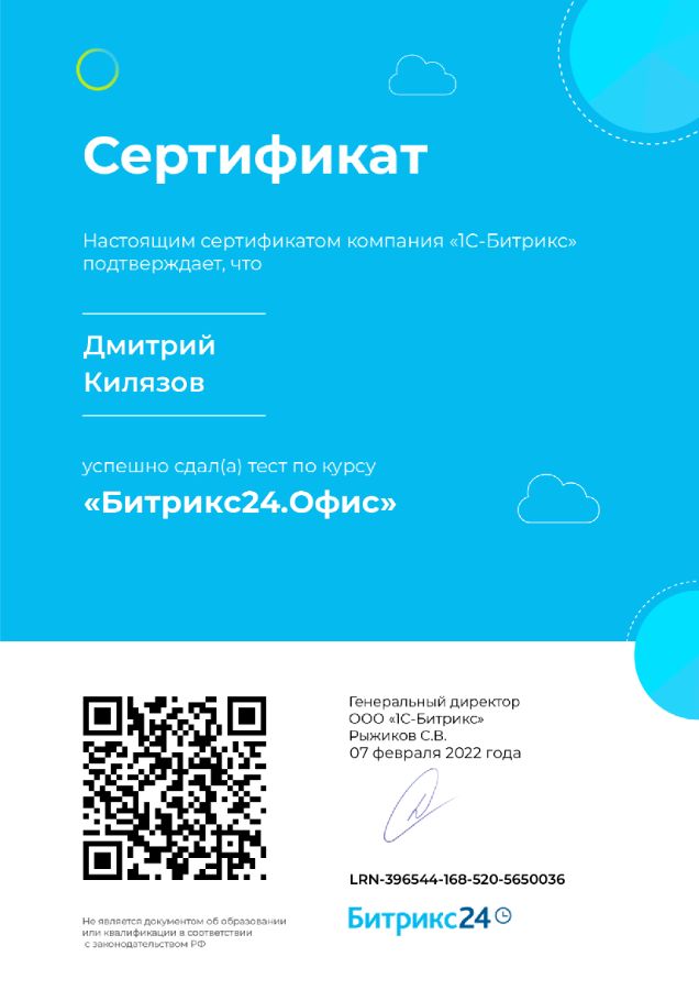 При этом, мы работаем по договору, основатель команды Дмитрий Килязов оформлен как Индивидуальный предприниматель. Есть статус партнера Битрикс24.
